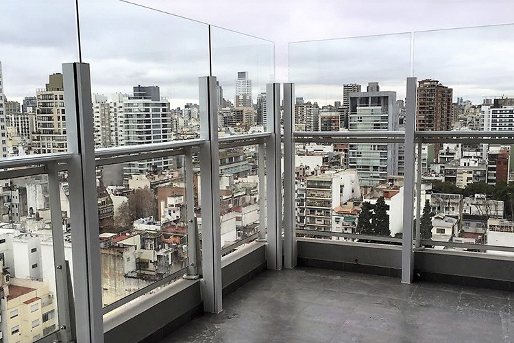 Descripción: Consiste en cristales soportados por parantes reforzados de aluminio fijados a la losa que permiten una muy fuerte y robusta barrera vidriada.