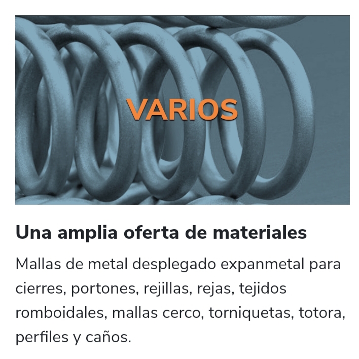 Descripción: Tenemos un gran stock de productos par la industria, entre ellos: Postes metálicos Poste metálico 40x4.2 altura 2.20mts. Poste metálico 40x4.2 altura 2.40mts. Tejido romboidal Tejidos romboidales en alambres n°12 y n°14 Alturas 1.80 mts y 2.00 mts. Torniquetas Galvanizadas n°2/6/7/8. Pintadas n°8 Grampas u y j Mallas soldadas Malla electrosoldada galvanizada 150*50*3,00mm x 2mts. Altura rollo de 12 y 24 mts. Totora metálica. Planchuelas 2 Y 6 mts. Bobina de enfadar Alambre recocido aceitado 1.73mm x 45kgs. Caños estructurales Por 6mt cuadrados (1.6-2.00-2.50-3.20 MM) Caños estructurales por 6 mts. Rectangulares (1.6-2.00-2.50-3.20 mm) Perfil c x 12 mts de largo. (1.60-2.00-2.50-3.20mm) Mallas Acmafort para cierres perimetrales Alambres negros Alambres de púas por 500mts Metal desplegado yesero