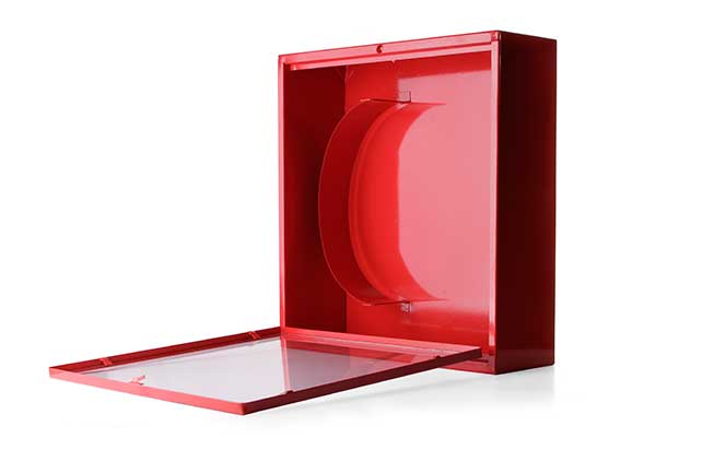 Descripción: Es un gabinete de línea estándar con una puerta abatible 180º en vidrio, rejilla u otro material a pedido. Tiene sector libre para la ubicación del carrete contra incendio de manguera ø 1" y pletina interior para sostener con firmeza el carrete contra incendio al momento de sacarlo hacia afuera del gabinete. El Gabinete es pintado con electrostática epóxica esmaltada color rojo Ral 3000 y se construye con un marco para puerta con 3 plisados en el interior para evitar descuadre tanto en estructura y puerta, proporcionando una caja hermética en el cierre para anular la entrada de humedad o aire salinos esto beneficia al carrete contra incendio en mantenerlo en buen estado, su apertura es con manilla de fierro pintado y con dos cerraduras de presión tipo retén broche para asegurar aún más el cierre hermético.