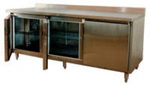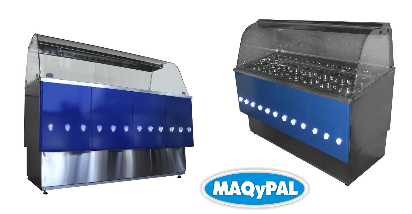 Descripción: Estructura en chapa de acero inoxidable, evaporador estatico, equipo 1/4 hp, bols de acero inox o vidrio, frente decorado con iluminación, heladera inferior con puertas traseras, modelos 1 mt y 1,5 mt.